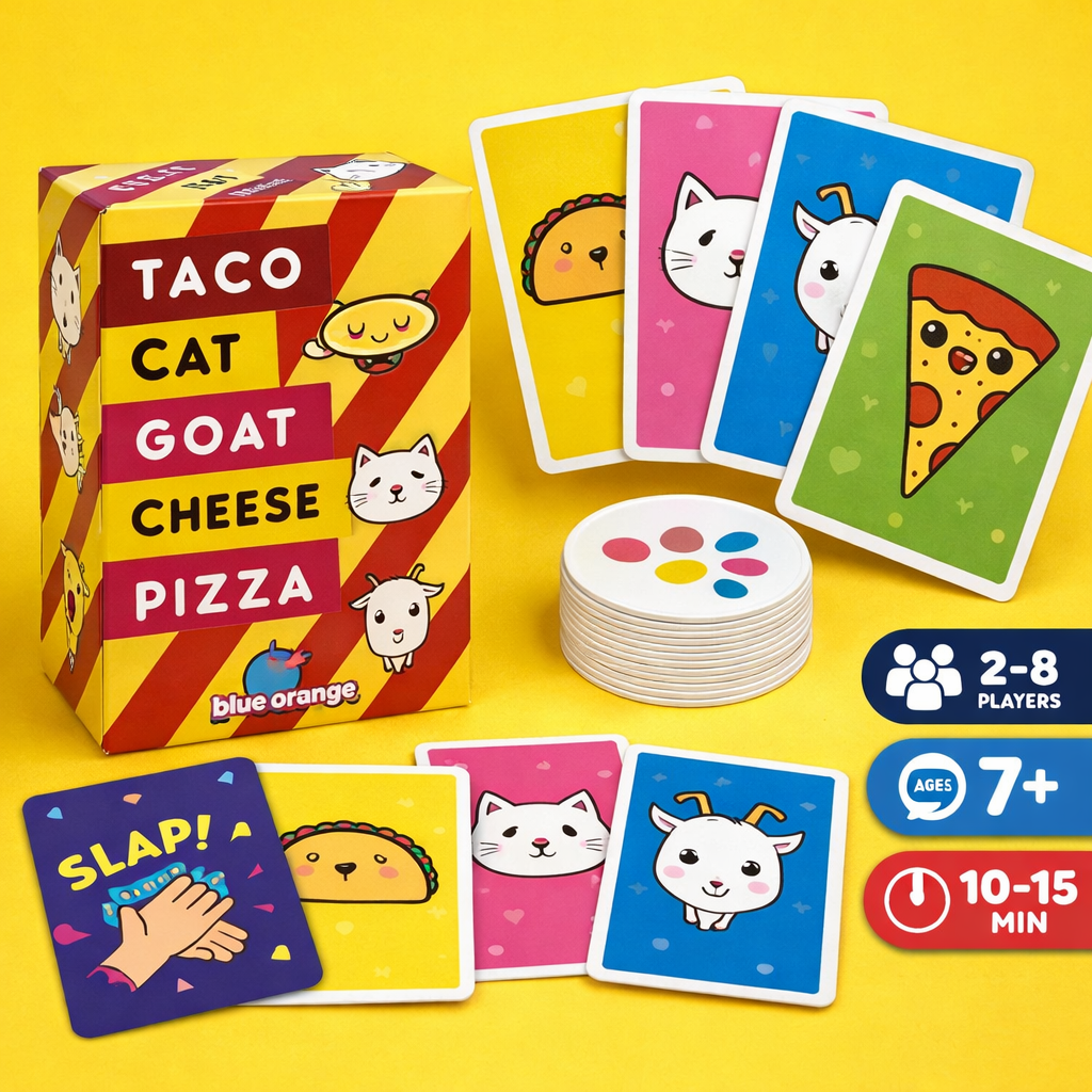 Get ready for laughter, speed, and chaos with the wildly popular Taco Cat Goat Cheese Pizza Party Card Game by Blue Orange! This fast-paced, easy-to-learn game is perfect for family game nights, parties, and gatherings, delivering non-stop fun in just 10–15 minutes.