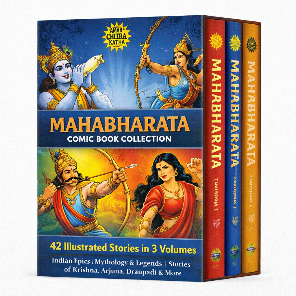The Mahabharata Comic Book Collection – 42 Illustrated Stories in 3 Volumes by Anant Pai (Amar Chitra Katha) is a beautifully crafted set that brings the timeless Indian epic Mahabharata to life through engaging storytelling and vibrant illustrations. This collection presents 42 captivating stories that cover the legendary tales of Krishna, Arjuna, Draupadi, Bhishma, Karna, and many more iconic characters.