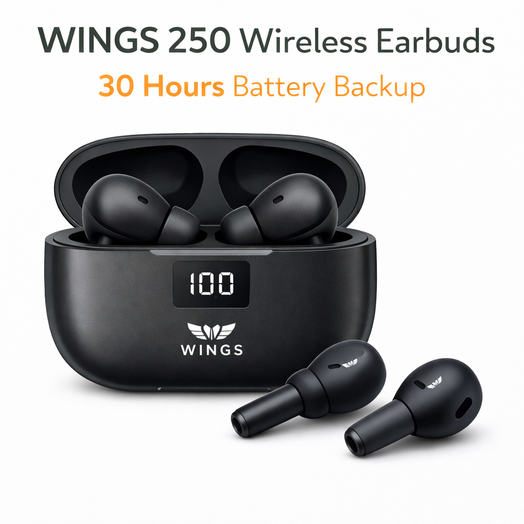 Upgrade your audio experience with WINGS 250 Wireless Earbuds, designed to deliver powerful sound and long-lasting performance. With an impressive 30 hours of total battery backup, these earbuds keep your music, calls, and entertainment going all day without interruptions.